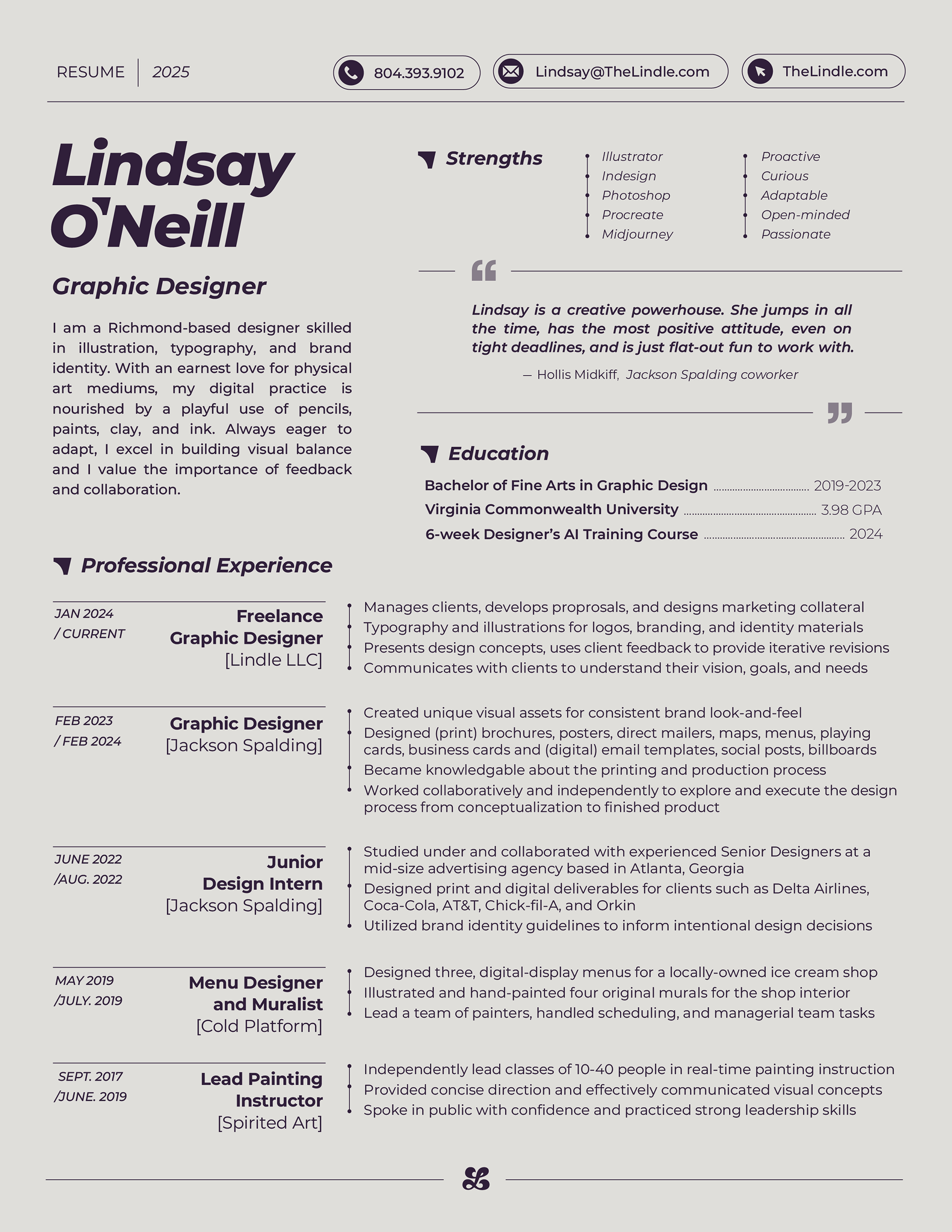 I graduated from VCU with a fine arts degree in graphic design. With a passion for building creative and effective forms of visual communication, as well as my experience at an advertising agency, I fell in love with the designer-client dynamic. Always eager to listen and adapt, I excel in building visual balance and hold value in the importance of feedback and collaboration. I am currently working as a freelancer and open to new opportunities! When I'm not designing, I enjoy socializing on the tennis court and love trying new recipes when cooking for my Gramma each week.