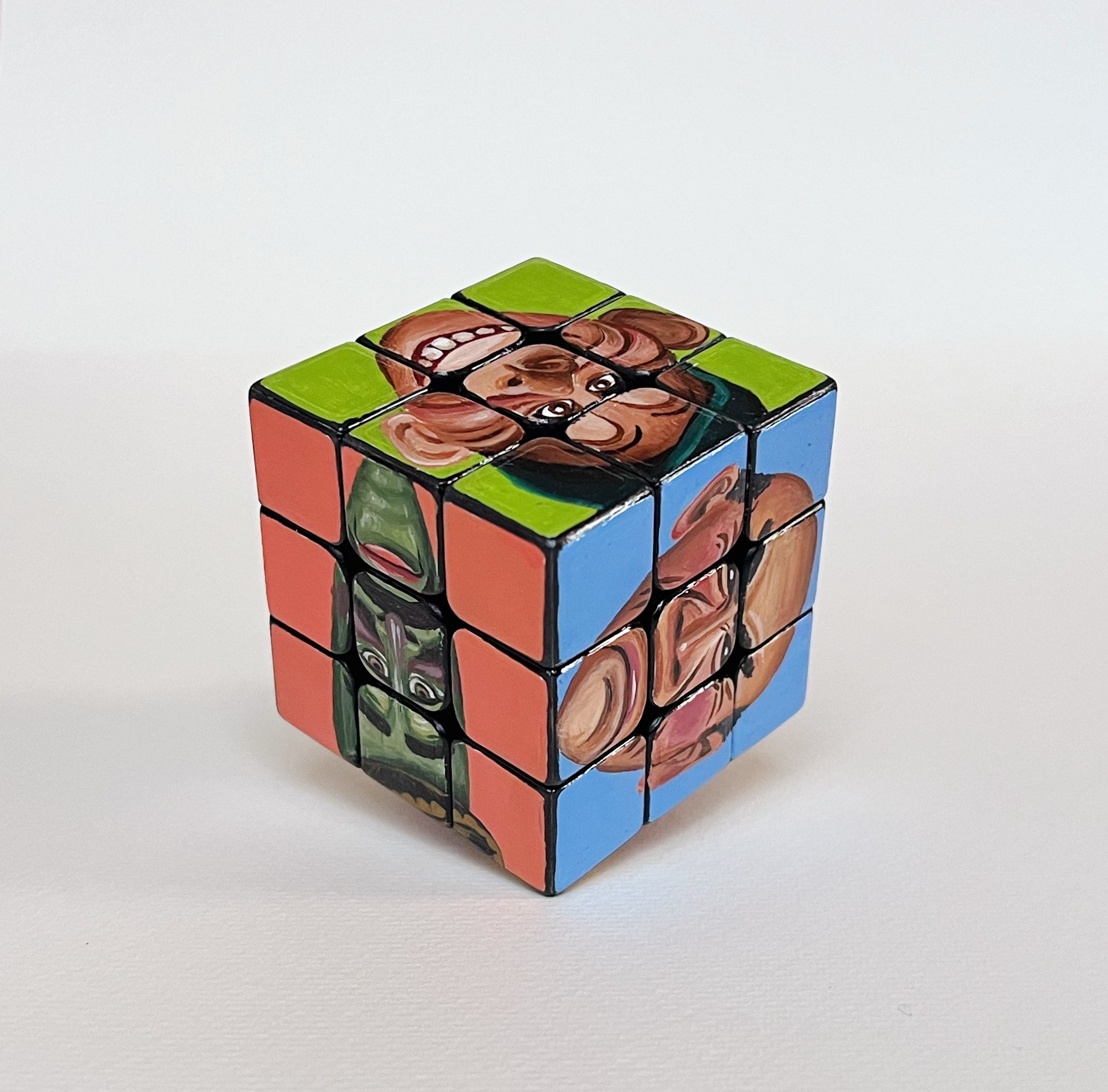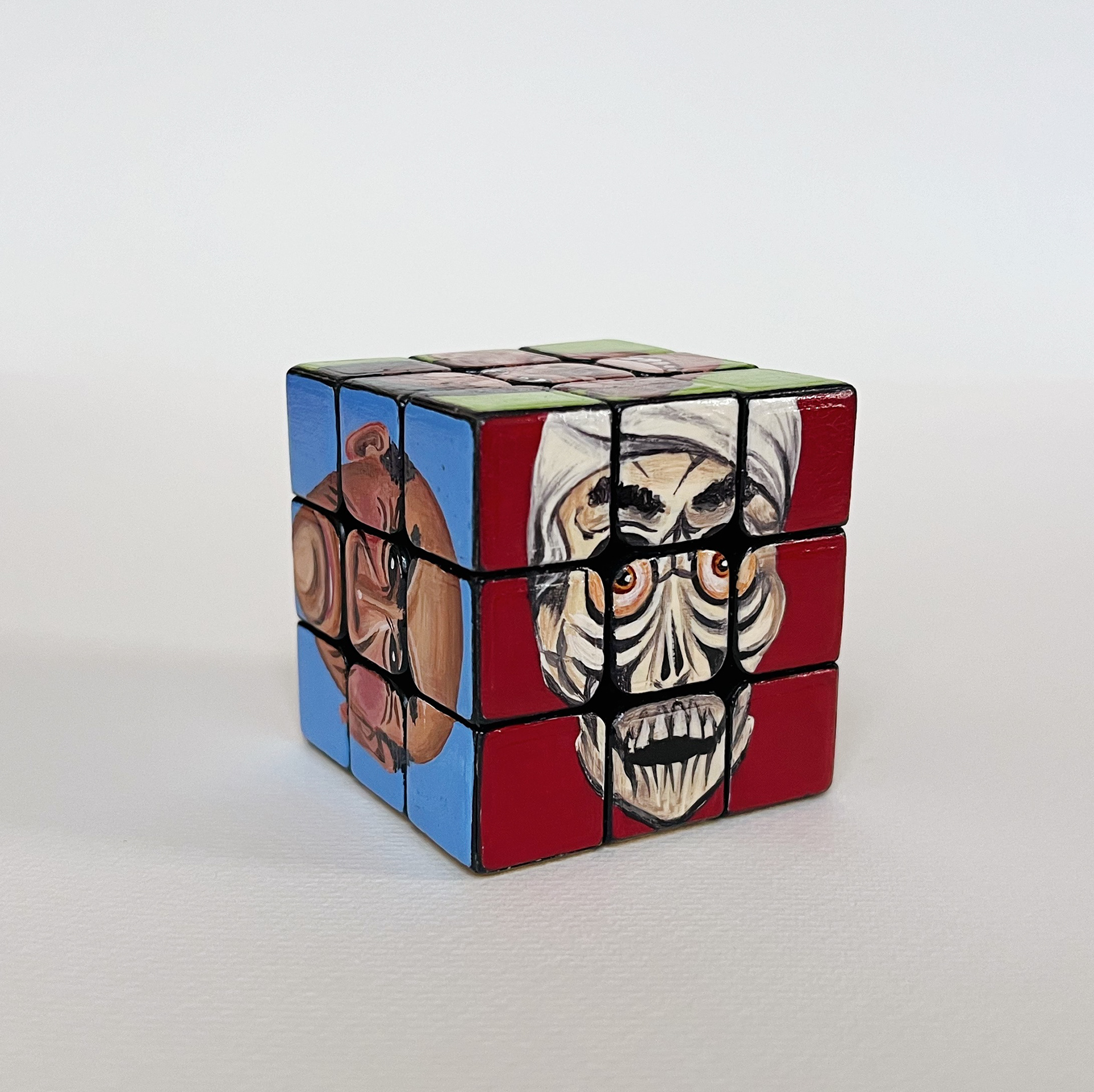 Hand-painted Rubik's cube featuring his unique ventriloquist puppet characters, a nod to his love of 90's toys.