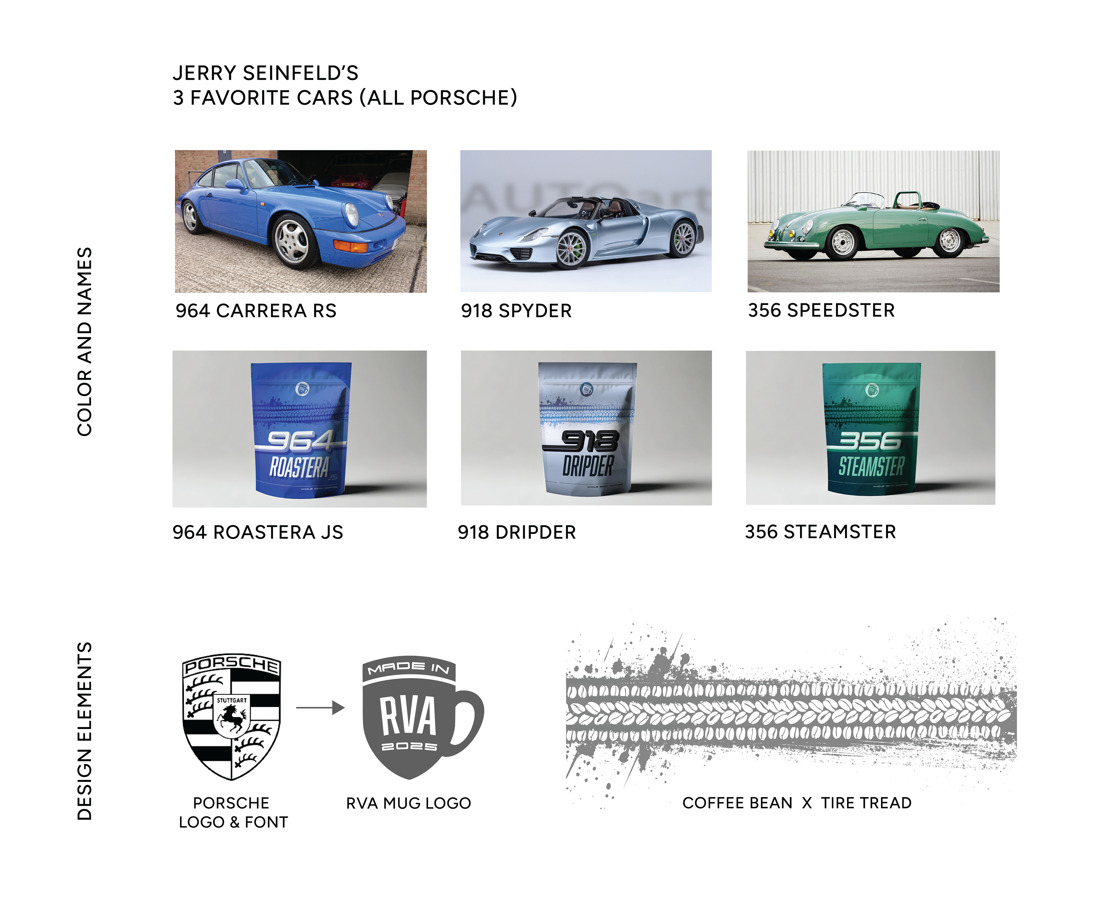 Custom coffee bags inspired by his series "Comedians in Cars Getting Coffee," his personal Porsche collection, and love of coffee.