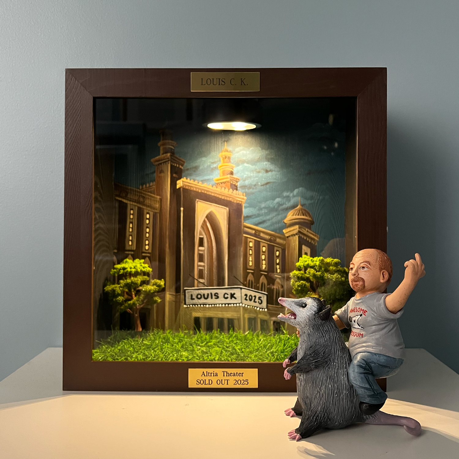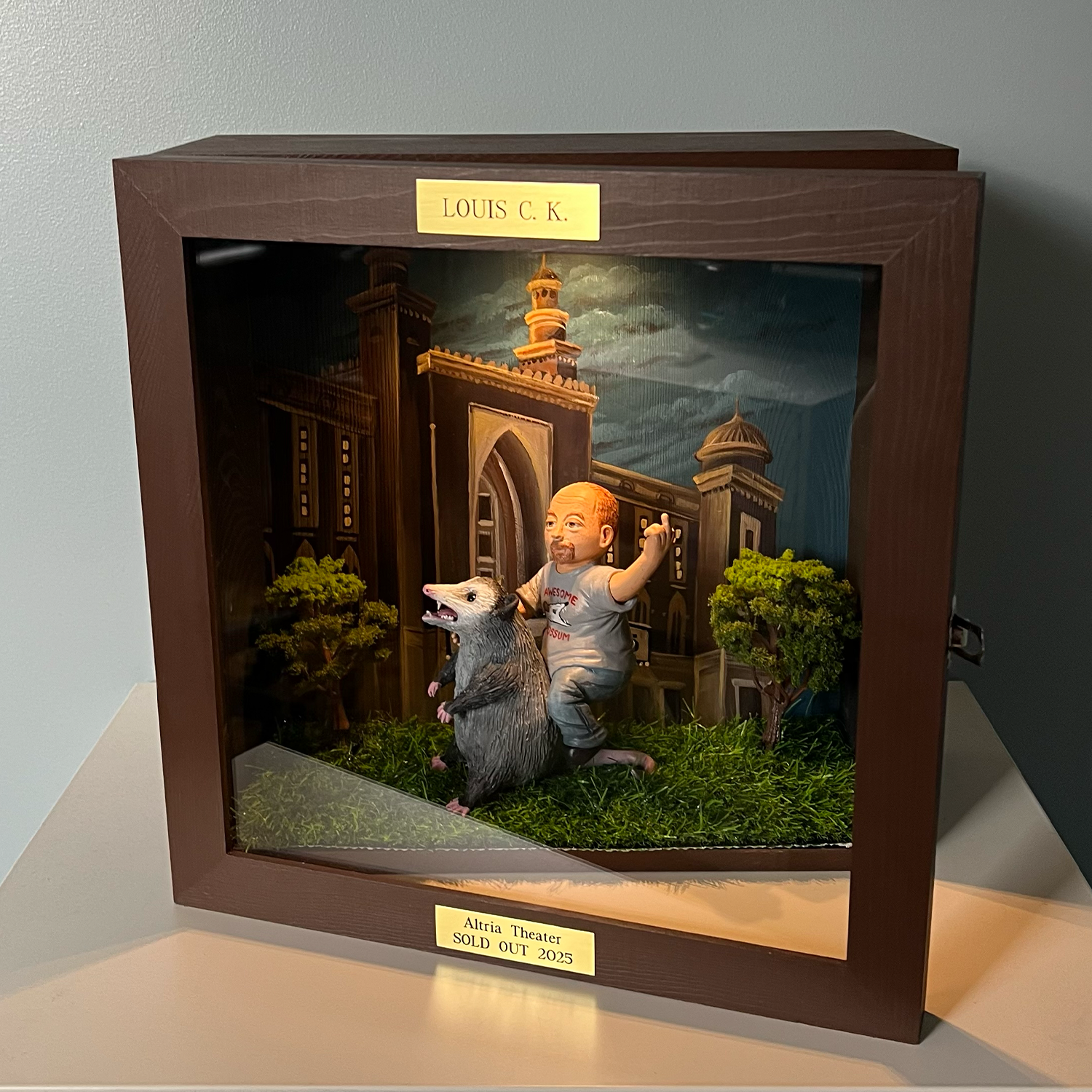 Hand-sculpted a clay figurine of him riding a possum, inspired by his stand-up bit referencing his rare possum shirt. Presented in a hand-painted terrarium display box.